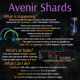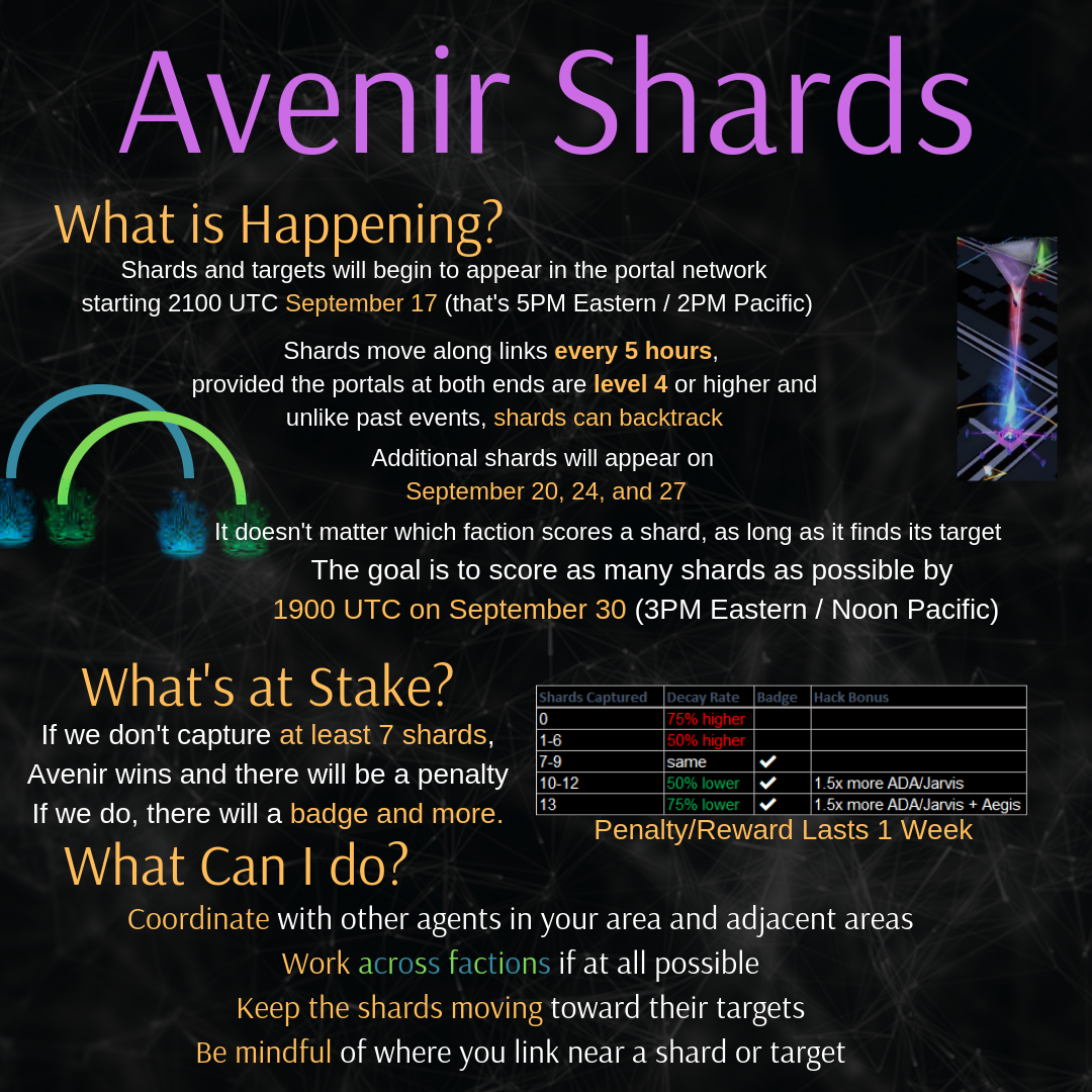 Not a joke this time, no snark. Shards are coming and this time faction doesn’t matter. We need to work together to score the shards. Badges and rewards if we win, penalties if we lose. Here’s a handy infographic for you. Or you can read the full version linked above.